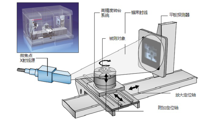 三维X射线扫描(简称CT)是以非破坏性X射线透视技术,将待测物体做360°自转,通过单一轴面的射线穿透被测物体,根据被测物体各部分对射线的吸收与透射率不同,收集每个角度的穿透图像,之后利用电脑运算重构出待测物体的实体图像。