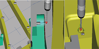| 1. 导入CAD数模常用的IGES格式或STP格式, 并将数模上与测量无关的零件隐藏 。 | 2. 利用自动测量点和圆命令,在数模上选取需 要检测的点和圆;本例中,需要检测检具型面、 定位孔及间隙面位置。 |